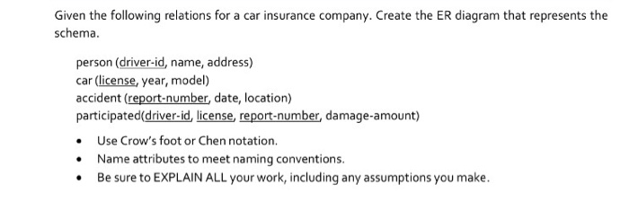 • This ER diagram OK if a manager gets a separate • Construct an ER diagram for a car insurance company whose customers own one or more cars each. Each car has associated with it zero to any number of recorded accidents. ... Access This Document